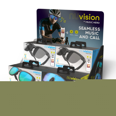 Espositore 8 occhiali da sole NU Vision by Music Hero con auricolari wireless e microfono modelli as