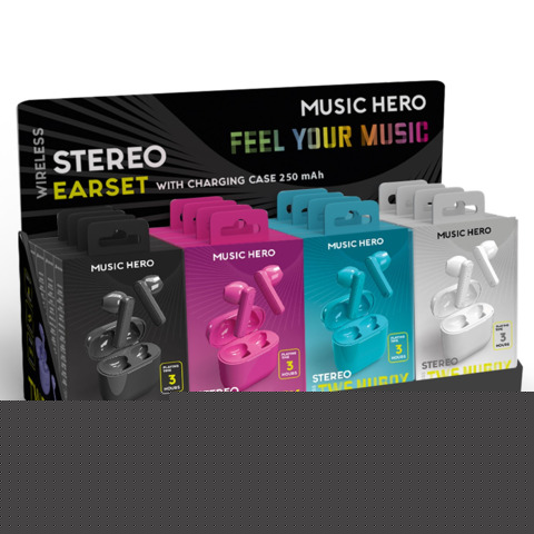 Espositore 16 auricolari wireless TWS Music Hero Nubox semi in-ear colori assortiti - EXPO-MHTWSPK+
